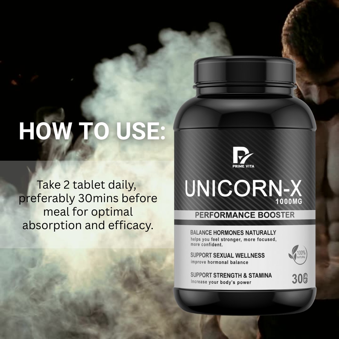 Prime Vita Unicorn-X is a powerful 1000mg performance booster designed for men who want to level up their strength, stamina, and vitality. Crafted with a potent blend of 100% natural ingredients, Unicorn-X helps balance hormones, support sexual wellness, and increase energy naturally. Whether you're hitting the gym or facing daily demands, Unicorn-X provides the support you need to feel stronger, more confident, and in control. Each bottle contains 30 easy-to-swallow capsules, ideal for daily use without compromise.